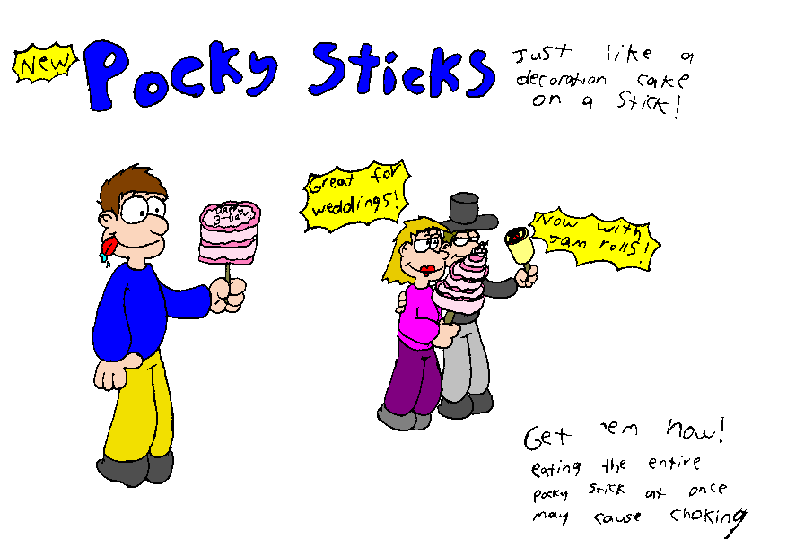Pocky Sticksby Alex Scobell Recently my brother went to Japan. He brought back a packet of prezel type sticks with icing on them. They were called Pocky Sticks and there phrase was Just Like A Decoration Cake On A Stick! So it inspired me to draw this.